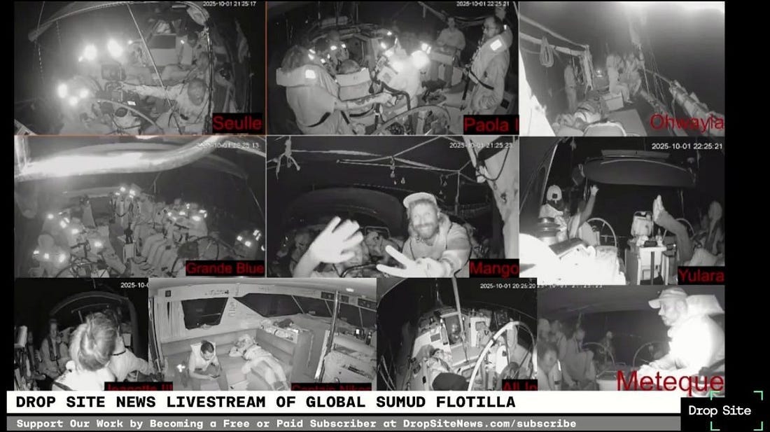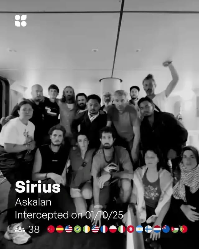 Hi All - At this minute Israel is attacking the Gaza Sumud Flotilla. Many of the 40 ships, with 500 people aboard, have been taken over by Israeli special forces. - BELOW I’ve pasted in an extremely useful post from Drop Site News, also on Substack. I recommend checking out Drop Site News for useful updates. Speaking as I write this is an Italian activist describing demonstrations happening in Italy, where a general strike has been called for by the major trade unions. Participants on the Global Sumud Flotilla are being detained by the Israeli military and taken into custody.Oct 1 Livestream from several boats in the Global Sumud Flotilla as Israel began detaining ships delivering humanitarian aid. The Israeli military has begun intercepting and illegally boarding boats participating in the Global Sumud Flotilla en route to the Gaza Strip—the largest effort yet to break the Israeli blockade on Gaza. Among the parliamentarians, lawyers, activists and journalists taking part in the flotilla is Drop Site News editor Alex Colston, who has been reporting live on the progress of the flotilla from the Sirius-Haifa boat. The flotilla consists of over 40 boats, with over 500 participants from dozens of countries around the world, attempting to deliver humanitarian aid. On Wednesday night, the Sirius was contacted by an official of the Israeli navy who informed passengers that they were violating a “lawful blockade” and stated that if the boats persisted on their course towards Gaza participants would be arrested and tried under Israeli law. They were under 90 nautical miles from the coast of Gaza. According to reporters documenting the flotilla from other ships, the Sirius was boarded shortly after by Israeli troops. As part of security protocols, Colston and other participants were instructed to throw their phones overboard before interception. As of midnight Gaza time (5 p.m. Eastern), six boats from the flotilla have been reported to be intercepted and boarded by the Israeli navy. The flotilla is roughly 60 nautical miles from its destination in Gaza, and other ships are continuing to proceed to their final destination despite the interceptions. Several ships participating in the flotilla have reported being hit with water cannons, chemical sprays, or being surrounded by unidentified ships believed to be under the command of the Israeli navy. A post shared by @globalsumudflotilla A post shared by @rimamobarak A post shared by @globalsumudflotilla A post shared by @globalsumudflotilla The Israeli Foreign Ministry posted a video of activist Greta Thunberg, who was also detained after sailing on a previous flotilla to Gaza this June, being arrested on X: “Already several vessels of the Hamas-Sumud flotilla have been safely stopped and their passengers are being transferred to an Israeli port. Greta and her friends are safe and healthy.” A post shared by @israelmfa In response to the attack on the flotilla, Italy’s two largest labor unions the Italian General Confederation of Labour (CGIL) and the Unione Sindacale di Base (USB), announced a nationwide general strike for Friday covering all public and private sectors. In a joint statement, the unions called the assault “a crime against unarmed people” and warned it was also “an attack on Italy’s constitutional order” as the flotilla contained Italian citizens. The union statement also denounced the Italian government for abandoning Italian workers and volunteers “in free international waters, in violation of our constitutional principles.” On Wednesday night, protests broke out in Athens, Berlin, Brussels, Barcelona, and other European cities to denounce the Israeli attack on the flotilla. The Colombian government led by president Gustavo Petro has also announced that it is expelling Israeli diplomatic officials in protest over the move. In a statement on X, Petro said that, “Two Colombian citizens have been detained in international waters who were engaged in human solidarity activities with Palestine,” adding that, if the news is verified, “I invite international lawyers to place themselves at the service of Colombia, alongside our lawyers. The free trade agreement with Israel is denounced immediately. The entire diplomatic delegation of Israel in Colombia leaves.” A post shared by @eye.on.palestine Naval ships from Spain and Italy escorted the flotilla for the past few days from Greek waters before pulling back from the flotilla at the so-called “orange line.” Several ships had been attacked by drones in an apparent attempt to intimidate the nonviolent activists to continue sailing toward Gaza. A post shared by @dropsitenews The livestream feeds for several more ships in the flotilla, yet to be boarded by Israel, is still available here: |